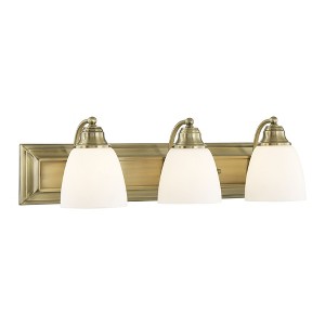 Collection: Springfield, Material: Steel, Finish Color: Antique Brass, Width: 24", Height: 7", Depth: 7", Height From Outlet Box: 4.5", Backplate Width: 24", Backplate Length: 4.5", Lamping Type: Incandescent, Number Of Bulbs: 3, Wattage: 100 Watts, Moisture Rating: Dry Rated, Desc: Bring a beautiful new look to your bathroom or vanity area with this charming three light bath fixture. A wide rectangular backplate in brushed nickel finish supports three simple arms that hold three glass shades in hand blown satin opal white glass. Mounting Direction: Up/Down / Shade Included: Yes. ,
