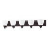 Collection: Springfield, Material: Steel, Finish Color: Bronze, Width: 36", Height: 7", Depth: 7", Height From Outlet Box: 3.5", Backplate Width: 36", Backplate Length: 4.5", Lamping Type: Incandescent, Number Of Bulbs: 5, Wattage: 100 Watts, Moisture Rating: Dry Rated, Desc: Bring a beautiful new look to your bathroom or vanity area with this charming five light bath fixture. A wide rectangular backplate in antique brass finish supports five simple arms that hold five glass shades in hand blown satin opal white glass.,