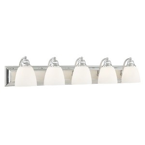 Collection: Springfield, Material: Steel, Finish Color: Polished Chrome, Width: 36", Height: 7", Depth: 7", Height From Outlet Box: 3.5", Backplate Width: 36", Backplate Length: 4.5", Lamping Type: Incandescent, Number Of Bulbs: 5, Wattage: 100 Watts, Moisture Rating: Dry Rated, Desc: Bring a beautiful new look to your bathroom or vanity area with this charming five light bath fixture. A wide rectangular backplate in antique brass finish supports five simple arms that hold five glass shades in hand blown satin opal white glass.,