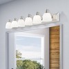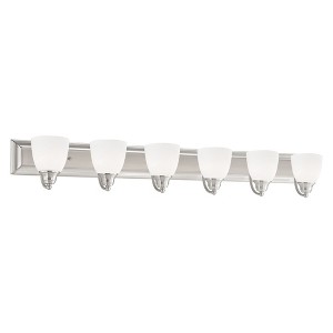 Collection: Springfield, Material: Steel, Finish Color: Brushed Nickel, Width: 48", Height: 7", Depth: 7", Height From Outlet Box: 3.5", Backplate Width: 48", Backplate Length: 4.5", Lamping Type: Incandescent, Number Of Bulbs: 6, Wattage: 100 Watts, Moisture Rating: Dry Rated, Desc: Bring a beautiful new look to your bathroom or vanity area with this charming six light bath fixture. A wide rectangular backplate in antique brass finish supports six simple arms that hold six glass shades in hand blown satin opal white glass.,