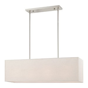 Collection: Summit, Material: Steel, Finish Color: Brushed Nickel, Width: 8.5", Height: 17.5", Length: 36", Hanging Method: Stem, Lamping Type: Incandescent, Number Of Bulbs: 4, Wattage: 160 Watts, Moisture Rating: Dry Rated, Desc: The Summit is a modern and functional linear chandelier which has a beautiful oatmeal fabric hardback shade and a white acrylic diffuser which will ensure soft illumination in any room.,