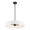 Collection: Venlo, Material: Steel, Finish Color: Black/Brushed Nickel, Width: 22", Height: 12.75", Hanging Method: Stem, Lamping Type: Incandescent, Number Of Bulbs: 4, Wattage: 160 Watts, Moisture Rating: Dry Rated, Desc: The Venlo collection is both modern and versatile. The satin brass finish with shiny white finish accents and hand-crafted off-white colored fabric hardback shade sets a pleasant mood. This sleek medium four-light drum pendant is a perfect fit for the living room, dining room, kitchen and bedroom.,
