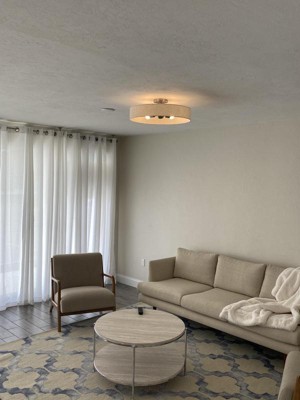 Collection: Venlo, Material: Steel, Finish Color: Brushed Nickel, Width: 22", Height: 7", Lamping Type: Incandescent, Number Of Bulbs: 4, Wattage: 40 Watts, Moisture Rating: Dry Rated, Desc: The Venlo collection is both modern and versatile. The bronze finish with antique brass finish accents and hand-crafted oatmeal colored fabric hardback shade sets a pleasant mood. This sleek large four-light drum semi-flush is a perfect fit for the living room, dining room, kitchen and bedroom. Canopy Included: Yes / Shade Included: Yes / Canopy Diameter: 5.13 x 0.75. ,