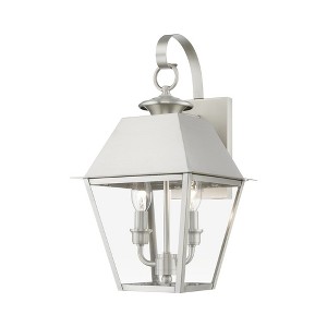 Collection: Wentworth, Material: Brass, Finish Color: Brushed Nickel, Width: 9", Height: 16.5", Depth: 10", Height From Outlet Box: 7", Backplate Width: 4.75", Backplate Length: 7", Lamping Type: Incandescent, Number Of Bulbs: 2, Wattage: 60 Watts, Moisture Rating: Dry Rated, Desc: With its appealing bronze finish and clear glass, the stunning Mansfield collection will make an elegant addition to any outdoor space. Formed from solid brass & traditionally inspired, this downward hanging two-light outdoor medium wall lantern is perfect for a driveway, back porch or entry way. With superb craftsmanship and affordable price, this fixture is sure to be a timeless addition to your home.,