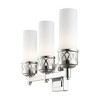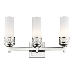 Collection: Westfield, Material: Steel, Finish Color: Polished Chrome, Width: 17.5", Height: 10.75", Depth: 4", Height From Outlet Box: 8", Backplate Width: 4.5", Backplate Length: 4.5", Lamping Type: Incandescent, Number Of Bulbs: 3, Wattage: 60 Watts, Moisture Rating: Dry Rated, Desc: Featuring a smooth cylindrical hand blown satin opal white glass shade for a discerning touch, this contemporary bath fixture features a round framing and classic squared backplate. Finished in an on-trend brushed nickel hue, it's a definitive look for contemporary and classic looks alike. Mounting Direction: Up/Down / Shade Included: Yes. ,
