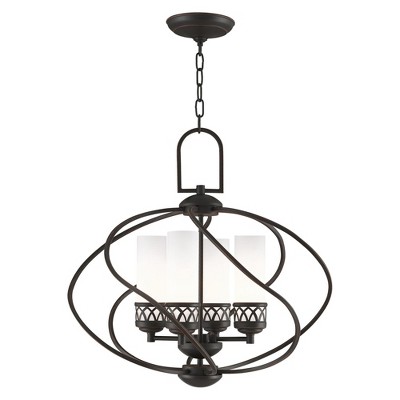 Collection: Westfield, Material: Steel, Finish Color: Olde Bronze, Width: 26", Height: 24", Hanging Method: Chain, Chain Length: 36", Lamping Type: Incandescent, Number Of Bulbs: 5, Wattage: 300 Watts, Moisture Rating: Dry Rated, Desc: The transitional Westfield collection has a sophisticated style combining intensely divergent design elements. The rustic wrought iron has been hand-crafted into soft, flowing curves, and the cylindrical hand blown satin opal white glass create a striking contrast to the olde bronze finish.,