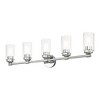 Collection: Whittier, Material: Steel, Finish Color: Polished Chrome, Width: 35", Height: 9.75", Depth: 4.75", Height From Outlet Box: 7.38", Backplate Width: 4.75", Backplate Length: 0.75", Lamping Type: Incandescent, Number Of Bulbs: 5, Wattage: 60 Watts, Moisture Rating: Dry Rated, Desc: Illuminate your home with a bright design from the Whittier collection. This large five-light vanity sconce features a polished brass finish with clear glass. Perfect for a contemporary or transitional luxury bathroom setting.,