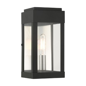 Collection: York, Material: Brass, Finish Color: Black, Width: 4.5", Height: 9", Depth: 3.9", Height From Outlet Box: 5.13", Backplate Width: 4.5", Backplate Length: 8.5", Lamping Type: Incandescent, Number Of Bulbs: 1, Wattage: 60 Watts, Moisture Rating: Dry Rated, Desc: The simple rectangular shape of the York collection is an updated classic transitiol line that will complement most home exteriors. The hand crafted solid brass construction is finished in black. The clear glass exposes the brushed nickel candle set off by the brushed nickel stainless steel back reflector giving an illusion of a double light effect. Greet your visitors with this small single-light wall lantern providing your home with a stunning and welcoming air. Shade Included: Yes. ,