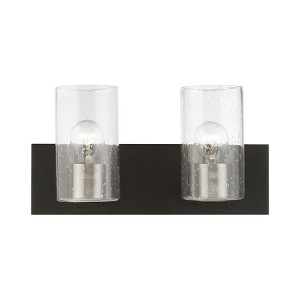 Collection: Zurich, Material: Steel, Finish Color: Black/Brushed Nickel, Width: 15", Height: 7.75", Depth: 5", Height From Outlet Box: 5.5", Backplate Width: 4.5", Backplate Length: 0.75", Lamping Type: Incandescent, Number Of Bulbs: 2, Wattage: 100 Watts, Moisture Rating: Dry Rated, Desc: Illuminate your home with a bright design from the Zurich collection. This two light vanity sconce features a black finish with brushed nickel finish accents and clear seeded glass. Perfect for a contemporary or transitional luxury bathroom, bedroom or hallway setting.,