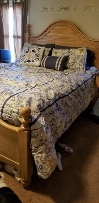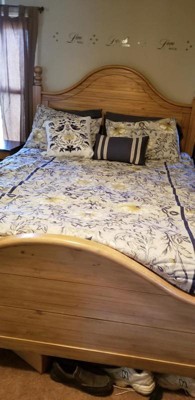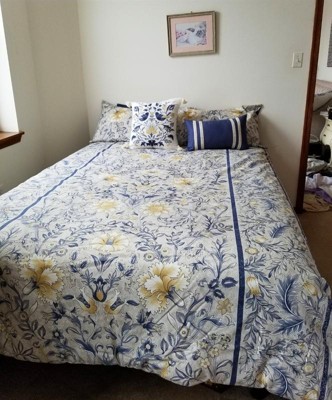 [This review was collected as part of a promotion.] I love the print on this comforter set. The colors go very well with my bedroom decor and colors. It's a perfect fit for our bed. The comforter is fluffy but not the softest we have ever owned. The side with the floral print design on has the texture of a soft burlap sack, or maybe a canvas. The other side, the plain blue side, is softer. The shams are lovely and the throw pillows are a nice addition. We especially love the one that is embroidered with the birds. Very cute! It's a beautiful comforter set that makes our bedroom feel warm and happy.