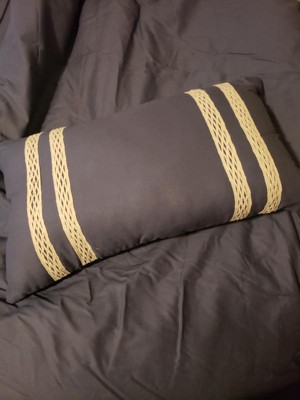 [This review was collected as part of a promotion.] Substantial comforter set. The comforter is a good weight with nice material and a unisex type of design. Not cheap feeling at all. The additional decorative pillows it comes with are lovely, well made, with nice embroidered material. Also comes with 2 large shams and a bed skirt.