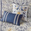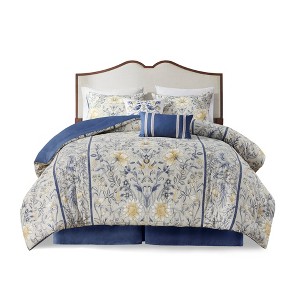 Upgrade your bedroom with our 6 Piece Cotton Comforter Set featuring a botanical print in yellow and blue hues. Made from 100% cotton, the set is oversized and overfilled for added comfort. The OEKO-TEX certification guarantees quality and wellness, and the set comes with 2 matching shams, 2 decorative pillows, and a solid blue bed skirt for a charming farmhouse look. The set arrives in compressed packaging and can be fluffed up with a steam iron for a wrinkle-free finish.