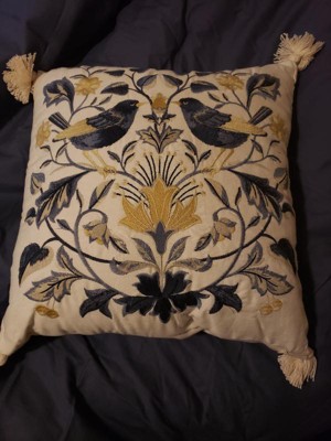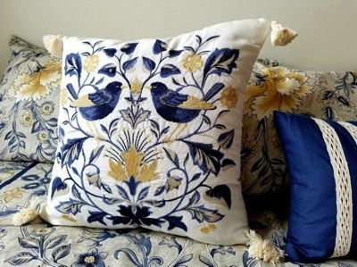 [This review was collected as part of a promotion.] I love the print on this comforter set. The colors go very well with my bedroom decor and colors. It's a perfect fit for our bed. The comforter is fluffy but not the softest we have ever owned. The side with the floral print design on has the texture of a soft burlap sack, or maybe a canvas. The other side, the plain blue side, is softer. The shams are lovely and the throw pillows are a nice addition. We especially love the one that is embroidered with the birds. Very cute! It's a beautiful comforter set that makes our bedroom feel warm and happy.