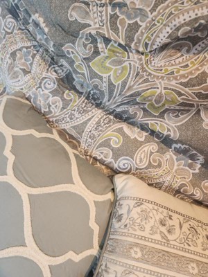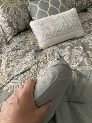 [This review was collected as part of a promotion.] This comforter set is so beautiful! The thickness of the polyester filled comforter and the 100% cotton shell makes it feel very luxurious. The colors are versatile with taupe, golden yellow, grey, light blue and white. The bedskirt is grey to match the pillows which are grey and white. The embroidery on the decorative pillows is high quality. I really love this set! It is very comfortable. It is machine washable. The decorative pillows are spot clean only. The shams are nice and roomy to put the pillows in easily. I highly recommend this comforter set.