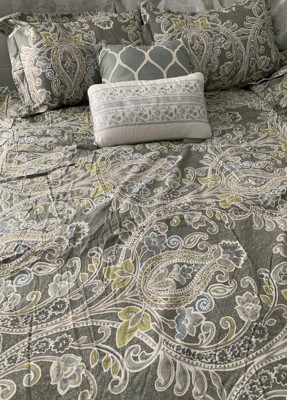 Transform your bedroom into an elegant and traditional retreat with the 6 Piece Cotton Comforter Set. Crafted from soft cotton sateen and boasting a luxurious damask pattern in soothing grey, blue, and yellow hues, this set includes an oversized and overfilled comforter, coordinating shams, decorative pillows, and a bed skirt to complete the look. The OEKO-TEX certified construction ensures quality comfort and wellness, while the set's cotton sateen fabric promises incredible softness and comfort. Enjoy the timeless allure and unparalleled comfort of this beautiful, coordinated bedding set.