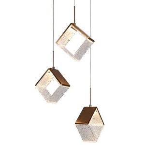 This 3-light pendant light presents a stunning visual display with its unique cluster shape, featuring three cubic acrylic lampshades that boast a textured surface reminiscent of cracked ice. The lampshades are designed to diffuse light softly, creating a warm and inviting atmosphere in any space they adorn. Each shade is suspended at varying lengths from a central canopy, lending a dynamic sense of movement and depth to the arrangement.