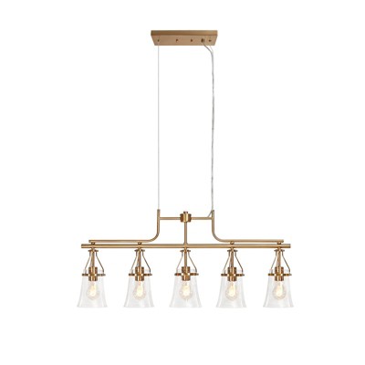 Design: Sculpted brass arms extend in fluid curves to support three clear glass domes, offering a graceful yet contemporary look,perfect over dining tables or kitchen islands.
