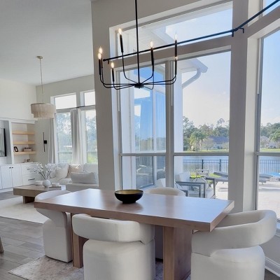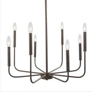 Illuminate your space with our stunning 8-light linear black metal chandelier. Crafted from a sturdy metal structure, this chandelier exudes a rustic black finish, showcasing a luxurious touch. Its candle-style design, without cups on the arms, creates a concise and distinctive silhouette that adds a modern and elegant look to any space, perfectly suited for traditional abodes and modern farmhouses. Setting it apart from common matte black finishes, this chandelier features a black finish adorned with white speckles, infusing it with a rustic flair. Versatile and stylish, this chandelier is an ideal choice for your dining room, kitchen island table, living room, foyer, or bedroom, elevating your space with its captivating presence.