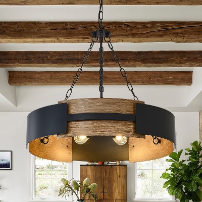 LNC Salle 4-Lights 16" Modern Farmhouse Drum Small Chandelier,Matte Black and Antique Brown Wood Grain