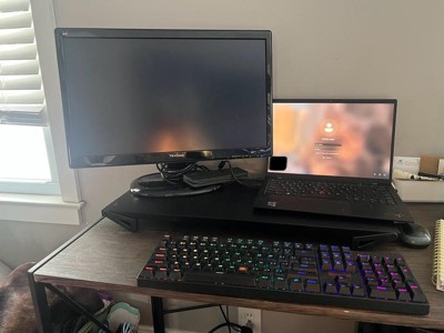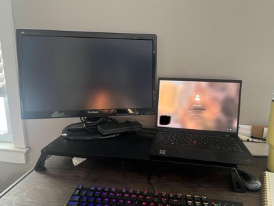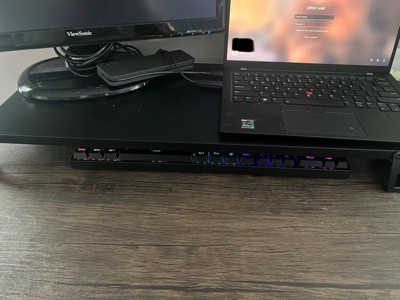 [This review was collected as part of a promotion.] This stand is great for raising your monitor and/or laptop. There are 2 height setting, about 1 inch and another at roughly 2 inches. This holds both my monitor screen and laptop (a little snug but it works). Quality is fine, nothing too crazy. There are little grip stickers you can place on the bottom of the feet so that it won’t slide. If you have it raised all the way it store a wireless keyboard very nicely! Overall the product works and looks sleek at my desk.