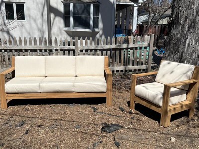 We bought the sofa and the matching chair. Very easy to assemble. They are large, solid pieces of furniture that feel really high quality. So far the cushions seem durable. Unwanted paw marks from our dog easily dust off by hand. We did purchase some furniture covers we put on them when not using to ensure they last as long as possible and maintain the original teak color.