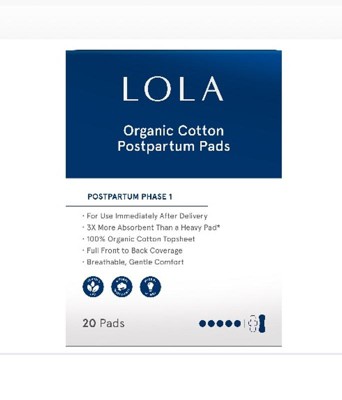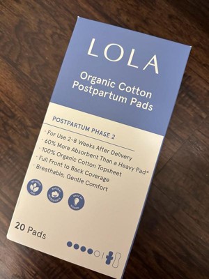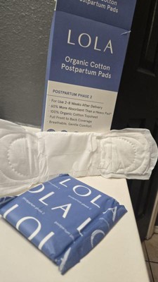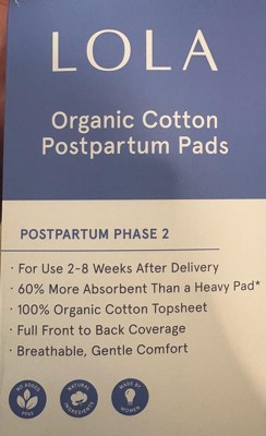[This review was collected as part of a promotion.] I really like the Lola organic cotton postpartum pads. I did use them for about 4 weeks after my delivery they're very absorbent and I like that there are 100% organic cotton they do feel very soft they did not cause any irritating their very gentle and breathable