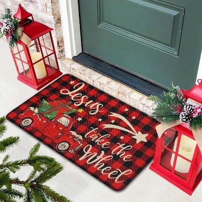 Lomsoe 1pc Christmas Buffalo Plaid Area Rug, Red Tartan Non-Slip Front Door Mat for Living Room Bedroom Kitchen Entryway.