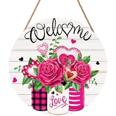 Lomsoe Happy Valentine's Day Rose Flower Front Door Sign Valentines Flower Wooden Door Hanging Sign For Anniversary Wedding Farmhouse Holiday 8x8Inch