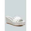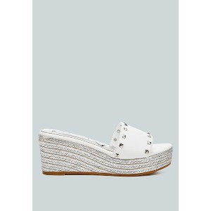 Redefining the espadrilles aesthetic with the metallic touch which adds an intriguing visual element. The stud embellishments also add an edgy element which makes the footwear standout. The espadrilles wedge sandals are perfect for summer beach parties! Type: Espadrilles Upper Material: Faux Leather Outer Sole: TPR Open Round Toe Stud Embellishments Woven Wedge Heel Heel Height: 2.5 inches Comfortable Cushion Insole SH4978