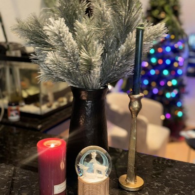 [This review was collected as part of a promotion.] This long needle flocked Christmas stem is absolutely beautiful! The details on it make it look so realistic. It will be absolutely beautiful in a vase. My only complaint is that the stem is a bit long for my decor. The flocking did shed some when I was shaping it and removed it from the packaging. Overall, it’s absolutely beautiful and looks extremely realistic. I received an incentive to write this review.