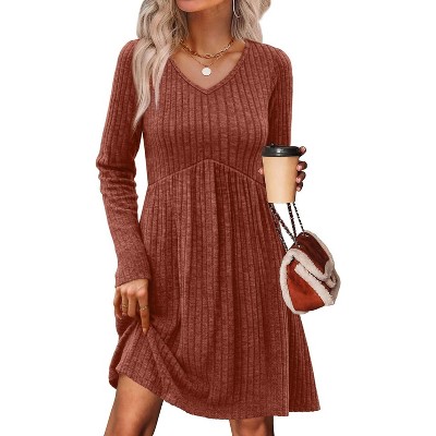 - FEATURES: v neck sweater dress, long sleeve, empire waist, babydoll design, above knee length, dressy casual, flowy fall fashion tunic dress, loose and flattering dresses to hide belly fat well.