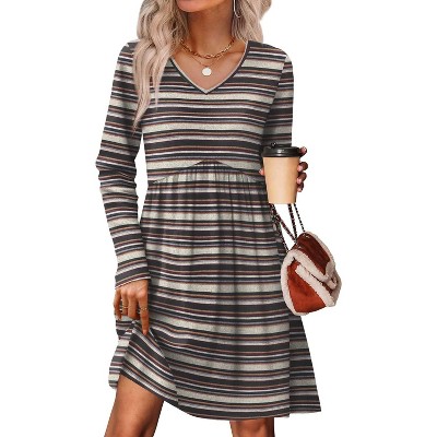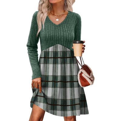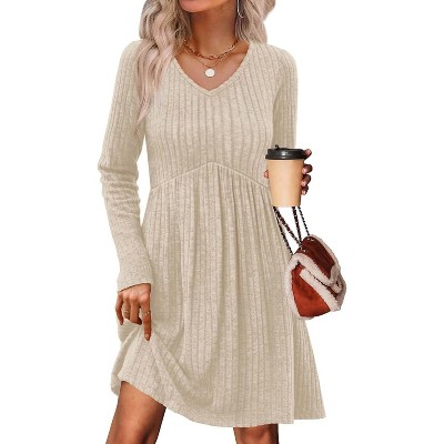 - FEATURES: v neck sweater dress, long sleeve, empire waist, babydoll design, above knee length, dressy casual, flowy fall fashion tunic dress, loose and flattering dresses to hide belly fat well.