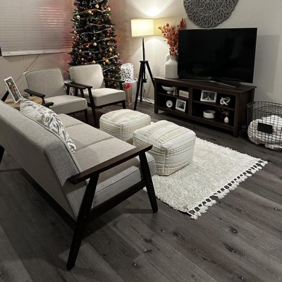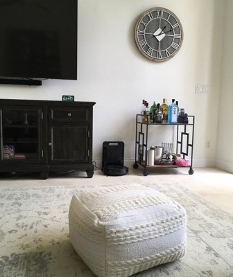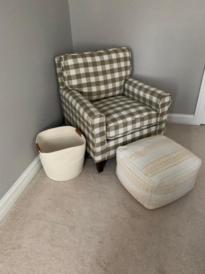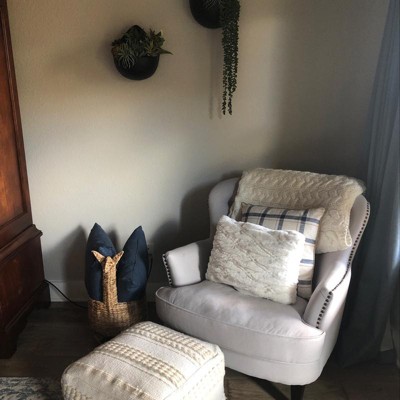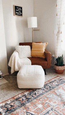 A beautiful neutral with texture and pattern that complements my family room furniture. Pillows and side basket table complete the look! A great height to put your feet up on and side enough to use as extra seating for a full house. All from Target!