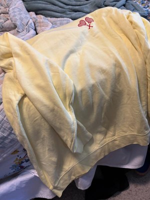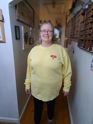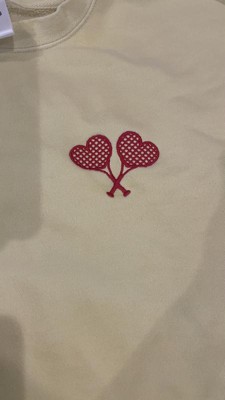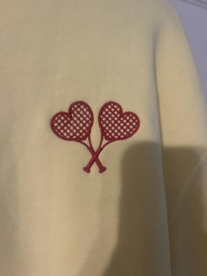 This sweatshirt is a blend of comfort and style, featuring a vibrant yellow color and cute embroidered heart-shaped tennis rackets. Guests appreciate its soft material and true-to-size fit, making it ideal for layering or lounging. While some noted minor quality issues like pilling, the overall design and warmth make it a great choice for cooler days. Its lightweight feel and cozy vibe add to its appeal for casual wear.