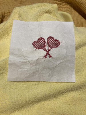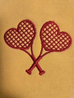 I afore this cute tennis love sweatshirt. The bright yellow is so vibrant. The tennis rackets embroidery is two heart shaped rackets. This is a roomy sweatshirt and so soft and cozy to wear on a cool evening.