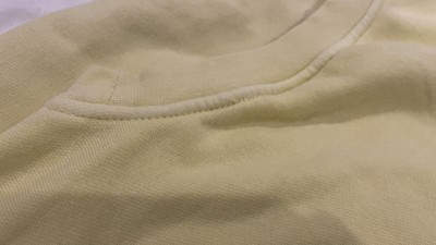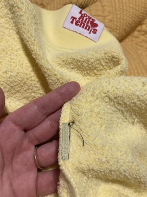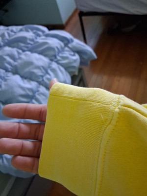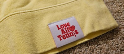 I really like the beautiful yellow color of this Love All Tennis sweatshirt. The inside pilled and left lint everywhere. The embroidered pattern in the chest is nicely done, along with the decorative tag on the bottom hem. The cuff on the wrist of the sleeve unfortunately had a hole in it.