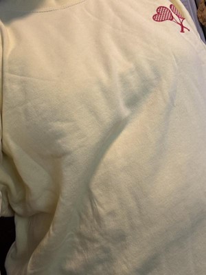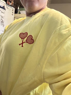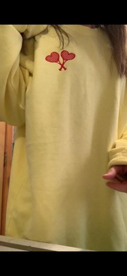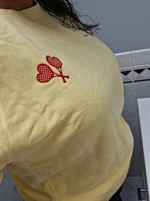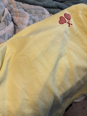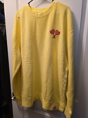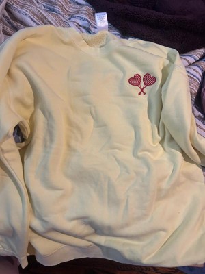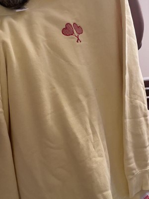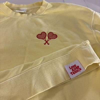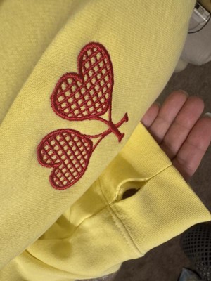 This sweatshirt is a blend of comfort and style, featuring a vibrant yellow color and cute embroidered heart-shaped tennis rackets. Guests appreciate its soft material and true-to-size fit, making it ideal for layering or lounging. While some noted minor quality issues like pilling, the overall design and warmth make it a great choice for cooler days. Its lightweight feel and cozy vibe add to its appeal for casual wear.