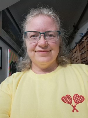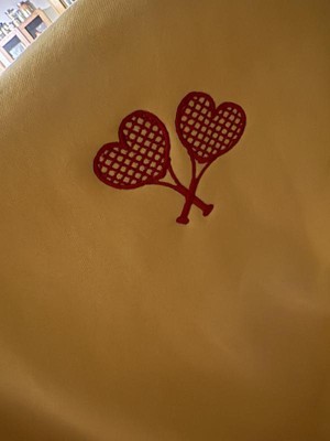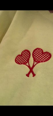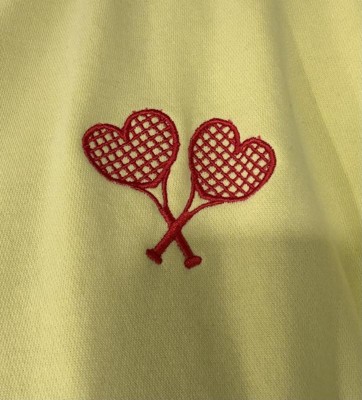 I afore this cute tennis love sweatshirt. The bright yellow is so vibrant. The tennis rackets embroidery is two heart shaped rackets. This is a roomy sweatshirt and so soft and cozy to wear on a cool evening.