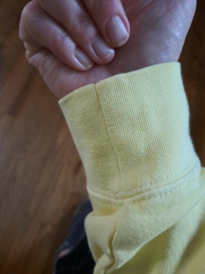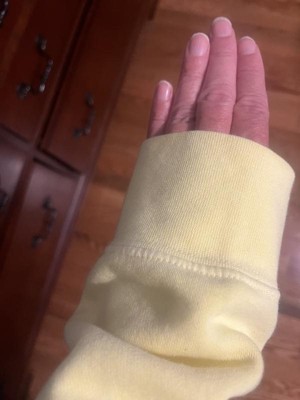 So happy with this sweatshirt. It's true to size and comfortable. Loving the yellow, its not overly bright. The sleeves are long but it makes for a good lounge sweater. The length is good as well. Can be worn for long fit or pulled up to your waist.