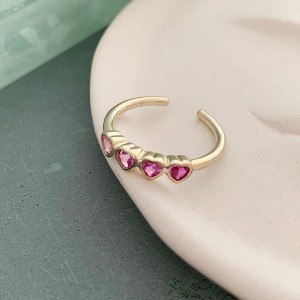 An adjustable ring topped with four dainty crystal hearts in a dreamy rainbow of pink hues. This playful stunner adds a sweet pop of color to your stack - perfect worn solo or layered with your go-to rings. Size: 5.5 - 7.5 (slightly adjustable). Heart crystals measure 4mm tall.