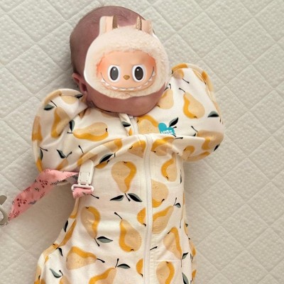 I'm truly amazed at how well this swaddle works. the arms have space for them to wiggle around and not tightly wrapped. I like how convenient the zipper is. The snug fit allows my baby to sleep soundly and doesn't get startled easily. My baby has started to sleep longer at night and I couldn't be more pleased because that means I get more rest as well. The pear design is just adorable and I can't wait purchase some more. My review was collected in exchange for sampling the product.