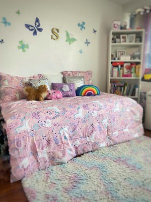 [This review was collected as part of a promotion.] The Lola Unicorn Comforter Set is beautiful and left my 4 year old saying “thank you mommy” over and over when she first saw it in her room! This is a good quality set - the material is nice and the stuffing in the comforter is sewn in well so it does not shift. The back of the comforter is a nice coordinating purple so it looks nice when it is turned down. The twin size comes with one pillow sham and also the two coordinating pillows. Typically you have to purchase coordinating pillows separately, and it was so nice that they are simply included with this set, as it makes the bedding look so much nicer. We already had a white bed skirt on the bed, and that would be a simple addition if one is looking for a bed skirt as well. Out of the box, you have to let the comforter decompress; after putting the comforter in the dryer it still was not as crisp as I would have liked. I put the comforter on the bed and used a spray bottle with water to smooth out the rest of the wrinkles - this was simple to do and now the bedding looks perfect. Overall, this is a great set and the only negative would be that the comforter is on the heavier side, so during these summer months it is being turned down all the way due to the heat.