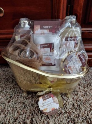 - Beautifully packaged bath basket in a vintage gold tub, this bath gift set makes for an extraordinary gift, and adds a lovely touch to the bathroom. Contains a Shower GeL(180ml), Bubble Bath(180ml), Body Scrub(50ml), Bath Salt(100g), 6 Bath Bombs, Rose Shaped Bath Pouf Sponge, Spacious Carry Cosmetic Bag and Gold Tub to play, storage or décor.