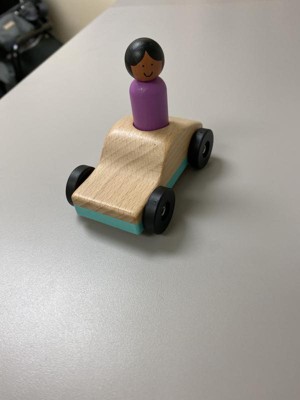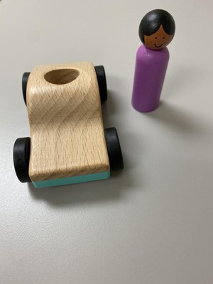 Super cute little basic car that’s a perfect fit for tiny hands. The little wooden person fits into a hole in the top of the car pretty easily. A very simple, fun, non-frustrating toy. Our little is very happy that you can make noise by hitting the person against the wheels and the wood. Lol!