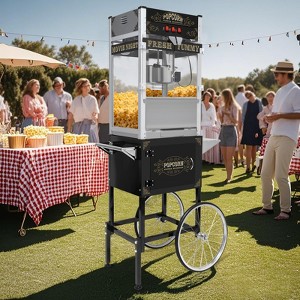 Featuring a portable design with bicycle-style wheels for easy transportation, this electric popcorn maker is a stand-up popcorn maker that will satisfy your snacking needs whether you're hosting a party or enjoying a family movie night.