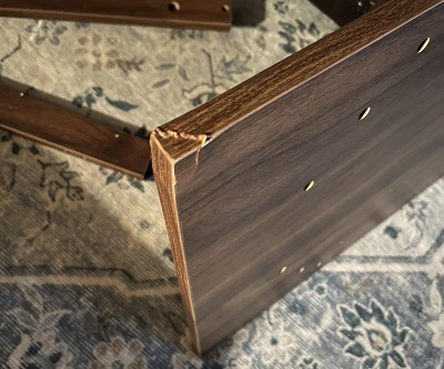 I am really happy with this piece of furniture. Sitting in the room, it looks more expensive than it was. Close views make the veneer more evident,