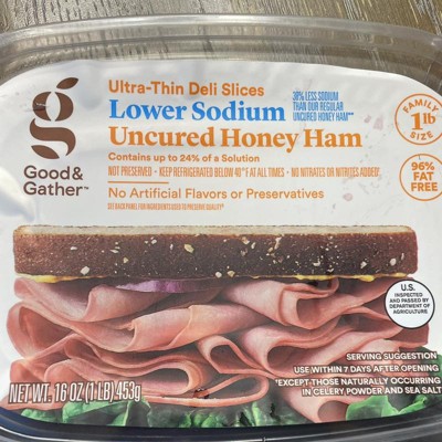 Enjoy the great sweet-meets-savory flavor of honey ham with 38% less sodium than our regular uncured honey ham when you make a classic ham sandwich with Lower Sodium**** Uncured* Honey Ham from Good & Gather™. No added nitrates and nitrites** ham has been cooked with honey to create delicious ham slices, but with reduced sodium content. In addition to the great flavor, you'll also appreciate that these honey ham slices contain no artificial flavors and artificial preservatives***. Pile the slices between two pieces of your favorite bread and add complementary condiments for a tasty sandwich, shred slices to mix into a salad, or heat up and serve with eggs for a hearty breakfast.