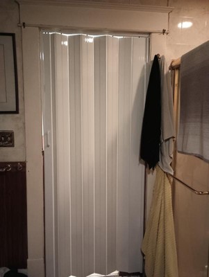 [This review was collected as part of a promotion.] We used this white accordion door in our garage area, in a door in between our work space and play space. The door arrived in a secure box, it was easy to open and install the same day. All of the parts were included and the door works well, it is smooth and does not stick or make loud noises when opening/closing.