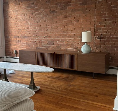 This wooden TV cabinet cleverly combines simple design with practical functions,TV Stands making it an ideal choice to enhance the style of the living room and storage efficiency. The middle of the cabinet is designed with grid elements, and the vertical striped hollow structure not only breaks the monotony and increases the sense of breathability,TV Stands but also injects geometric aesthetics into the whole, TV Stand smaking the cabinet more layered. TV Consoles slender legs combined with the narrow frame design visually "reduce" the weight of the cabinet, avoiding the bulky feeling of traditional furniture and making the space appear more transparent.