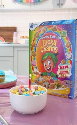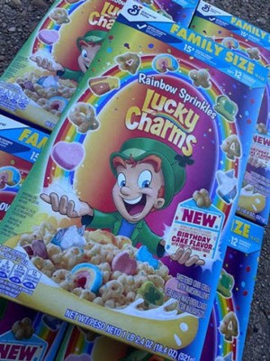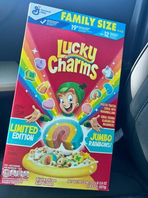 - CONTAINS: One cardboard box of crunchy Lucky Charms Rainbow Sprinkles Cereal with Marshmallows, Family Size, 18.4 oz; Perfect for instant snacking, or a part of breakfast and meals